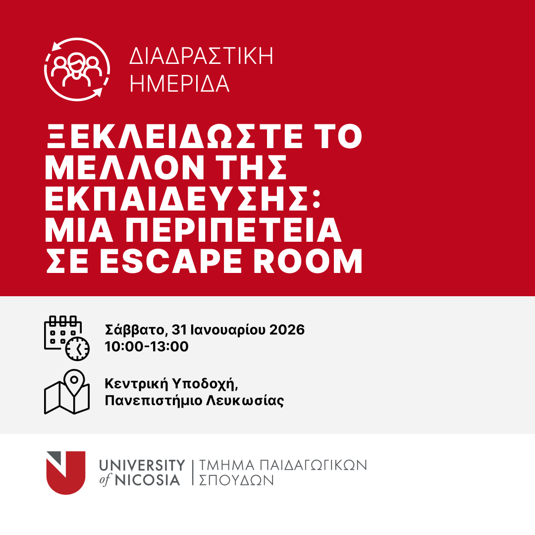 Το Τμήμα Παιδαγωγικών Σπουδών του Πανεπιστημίου Λευκωσίας διοργανώνει την προαναφερόμενη ημερίδα η οποία θα πραγματοποιηθεί στο Πανεπιστήμιο Λευκωσίας το Σάββατο 31 Ιανουαρίου, από τις 10:00-13:00.https://www.unic.ac.cy/el/event/imerida-xekleidoste-to-mellon-tis-ekpaideysis-mia-peripeteia-se-escape-room/
