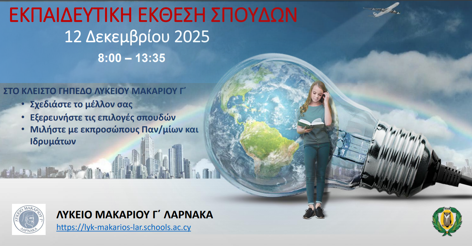 Στο πλαίσιο της Συμβουλευτικής Διεργασίας και τη δομημένη παροχή πληροφοριών προς τους μαθητές/τριες και τους γονείς οι Καθηγήτριες Συμβουλευτικής και Επαγγελματικής Αγωγής του σχολείου μας σάς προσκαλούν στην Εκπαιδευτική Έκθεση που διοργανώνεται την Παρασκευή, 12/12/2025 στο Κλειστό Γήπεδο του Σχολείου από τις 8:00 μέχρι τις 13:35. Στην Εκπαιδευτική Έκθεση θα εκπροσωπηθούν όλα τα Δημόσια και Ιδιωτικά Εκπαιδευτικά Πανεπιστήμια/ Ιδρύματα της Κύπρου (επισυνάπτεται πιο κάτω κατάλογος).