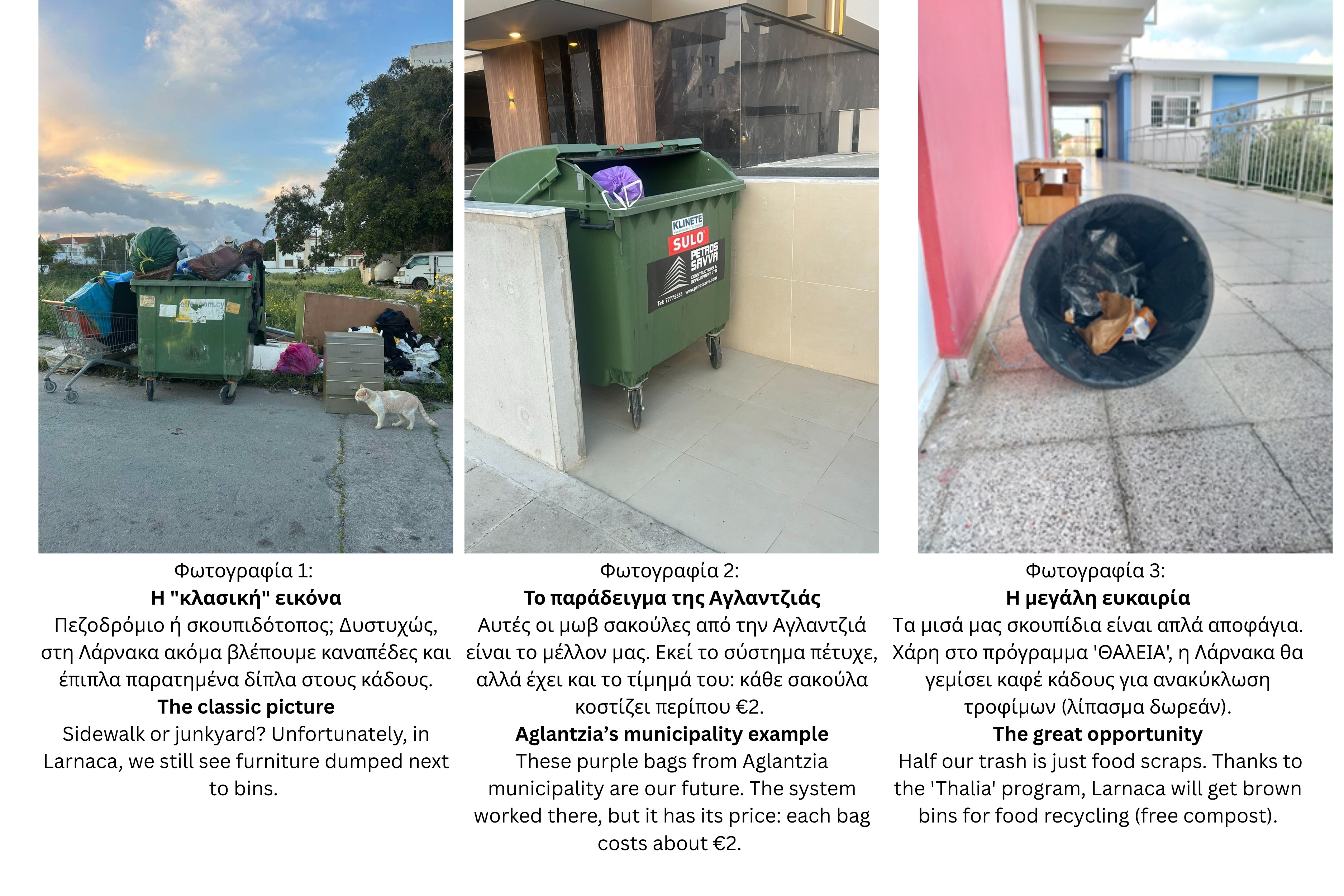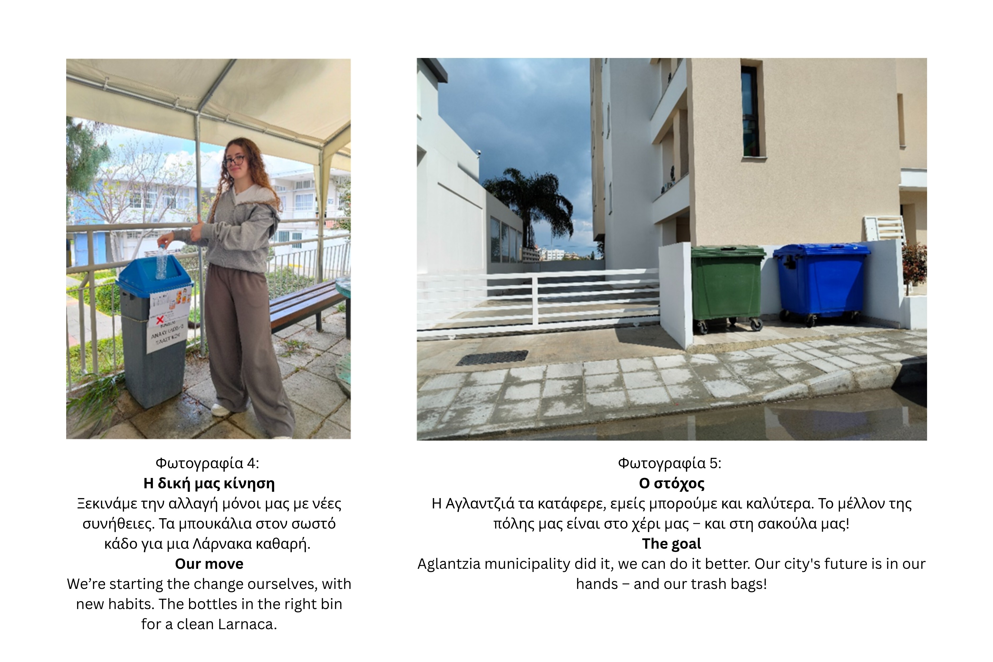 Οι μαθήτριες του τμήματος Α22, Ηλία Ραφαηλία, Γαβριέλα Αρετή Βλήσμα και Δήμητρα Καραγιάννη έφτιαξαν ένα φωτορεπορτάζ και έλαβαν μέρος στον εθνικό διαγωνισμό που διοργανώνεται από τον Εθνικό Φορέα τη CYMEPA. Το θέμα ήταν Λάρνακα: Η πόλη μας γίνεται πολύχρωμη! (Από τις μωβ σακούλες της Αγλαντζιάς μέχρι τους καφέ κάδους του προγράμματος «ΘΑλΕΙΑ»).